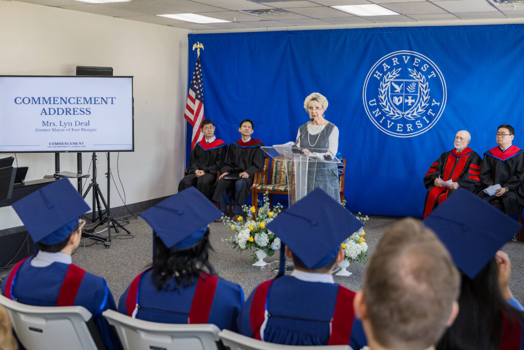 The ceremony featured a powerful commencement address by former mayor of Fort Morgan and local historian, Lyn Deal. She shared the building’s local history, explaining that it was built in the early 1900s as the town’s first high school. Later, when the new high school was built, it became a junior high. When the school was eventually closed and the building faced potential abandonment, Deal, who was deeply involved in advocating for preserving Fort Morgan’s historic buildings, worried for its fate. However, Harvest University’s establishment of the building gave new life to the structure, giving hope to Deal and the community.